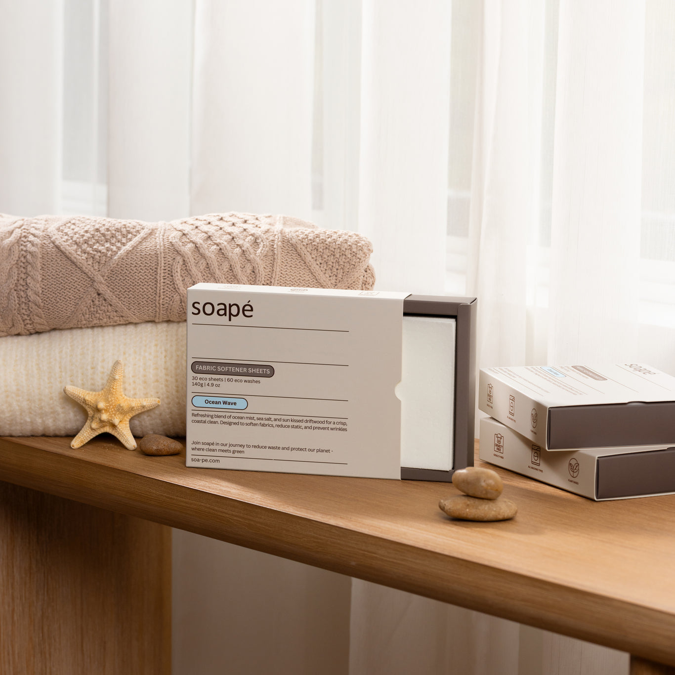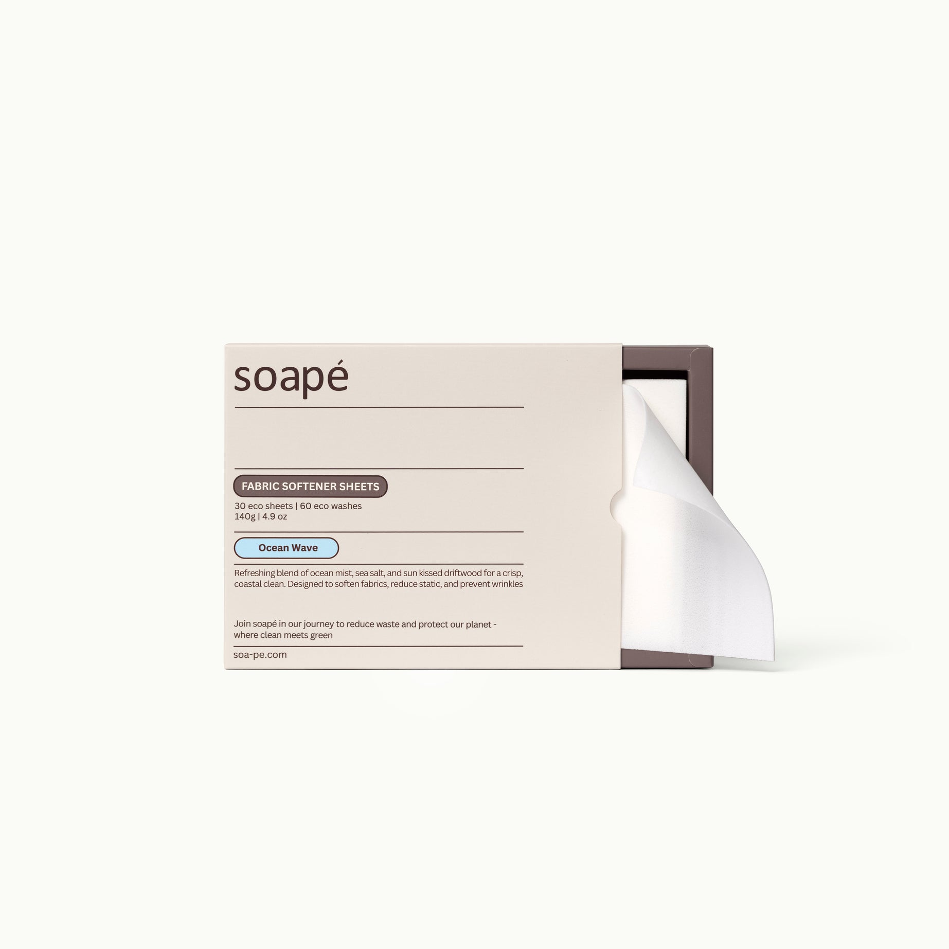 Made to enhance every wash with lasting softness, reduced wrinkles, and a clean, comforting scent - all designed to work seamlessly with our soapé detergent sheets.