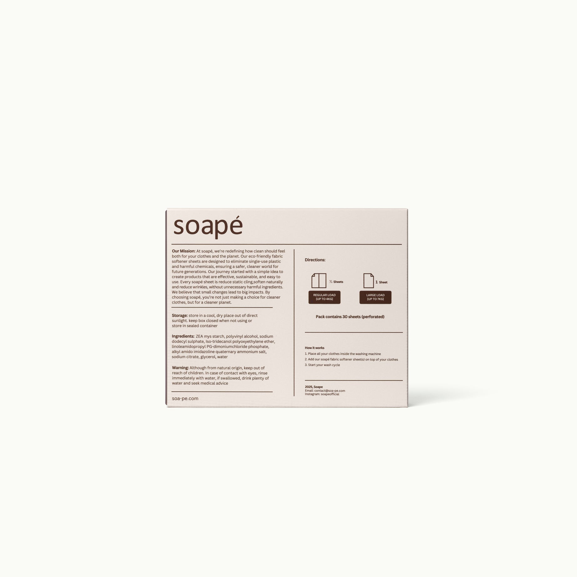 Made to enhance every wash with lasting softness, reduced wrinkles, and a clean, comforting scent - all designed to work seamlessly with our soapé detergent sheets.